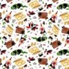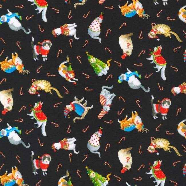 A black christmas fabric featuring cats wearing christmas hats and jumpers