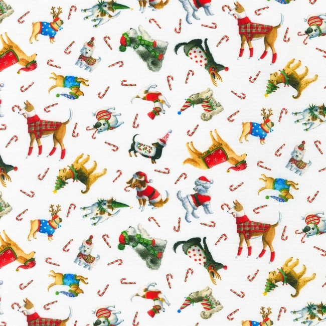 A white christmas fabric featuring dogs wearing christmas hats and jumpers