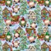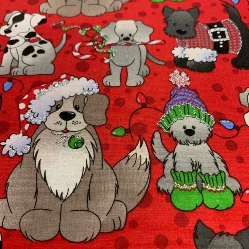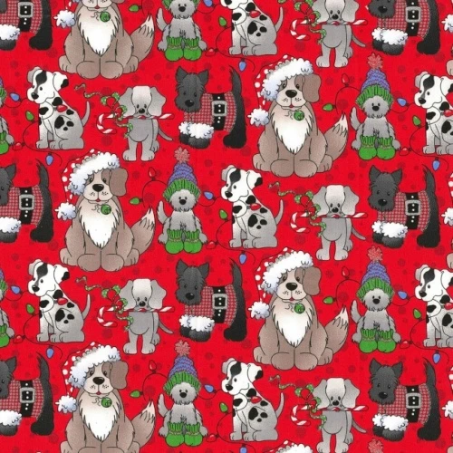 A red Christmas fabric showing puppies playing around with the Christmas Lights! From Fabric Traditions.