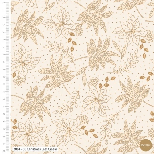 A cream christmas fabric showing gold metallic poinsettias