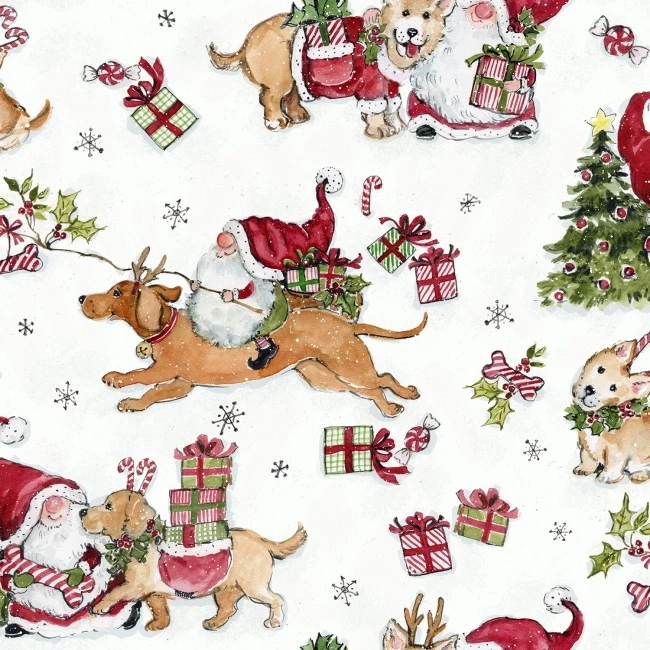 Father christmas gnomes delivering presents using puppies instead of reindeer