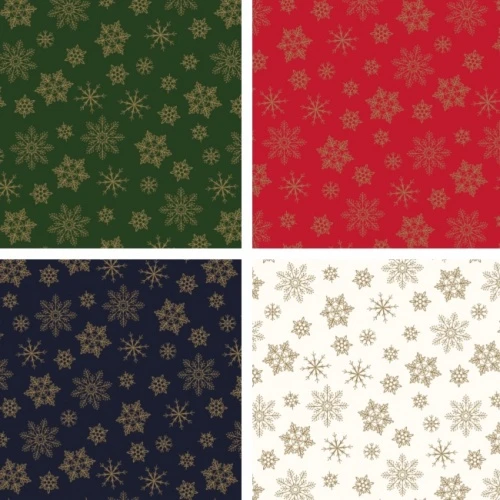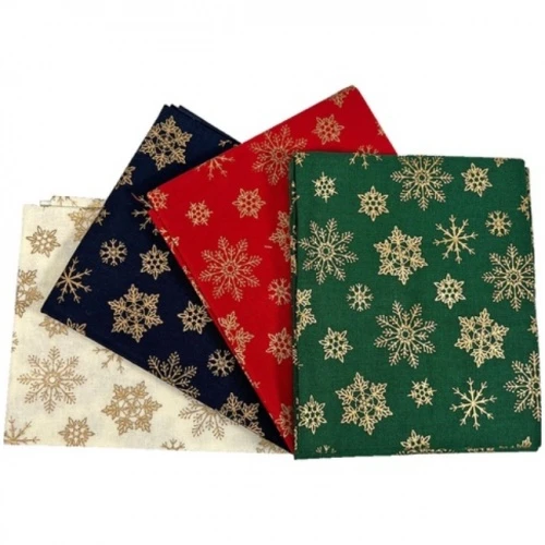 A christmas fabric collection of fat quarters featuring gold metallic snowflakes