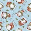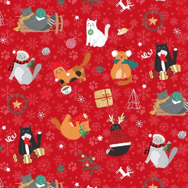 A red christmas fabric showing kittens causing trouble at christmas, playing with balls of wool, stockings, christmas presents and wearing wooly hats