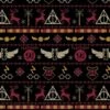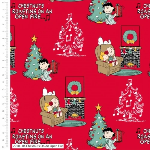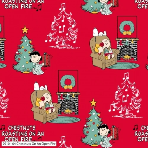A red christmas fabric, lucy opening presents under the tree with sally and charlie brown roasting chesnuts on an open fire